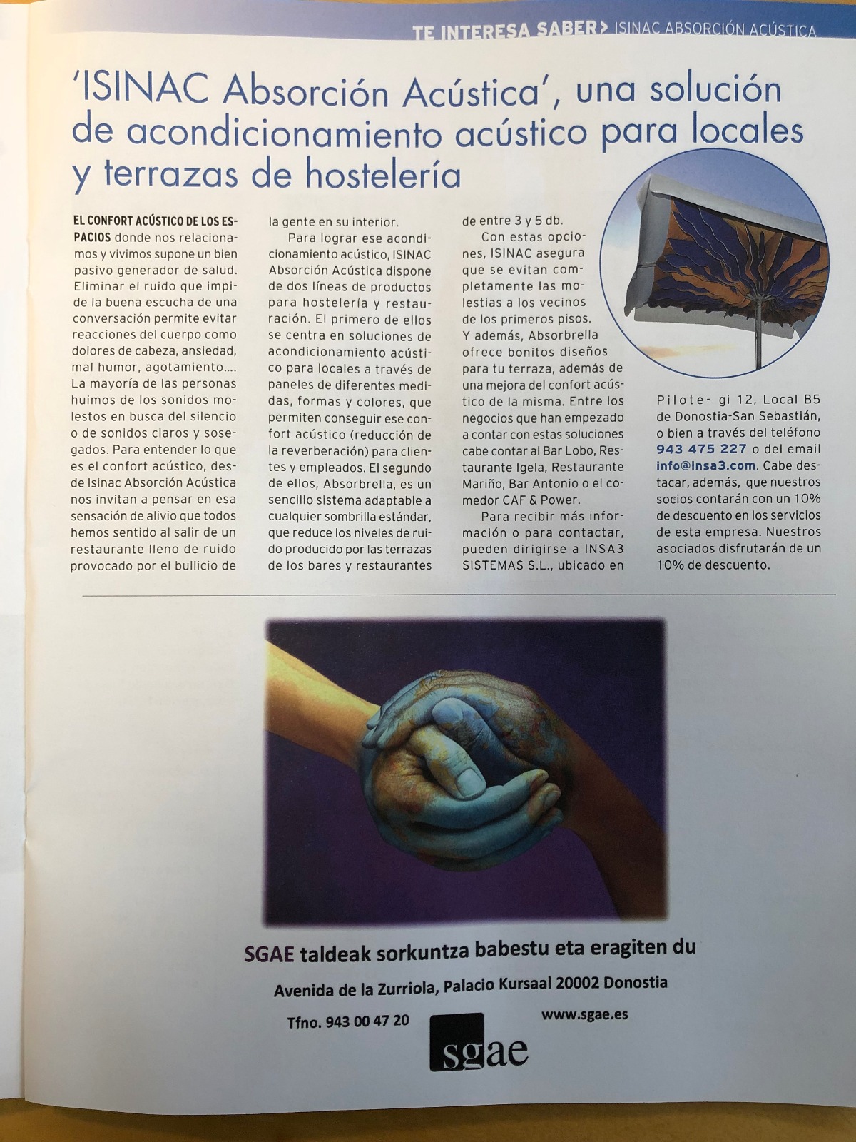 La revista de la Asociación de Hostelería del País Vasco, dedica en su último número, un artículo a nuestro sistema de reducción del ruido en las terrazas de los bares y restaurante. A continuación os dejamos el link de la revista, y una imagen con el artículo.